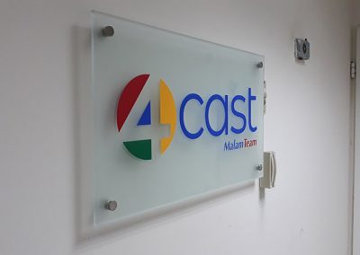 שלט זכוכית עבור חברת FIX digital זכוכית מחוסמת בשילוב מדבקות וניל בחיתוך צורני.